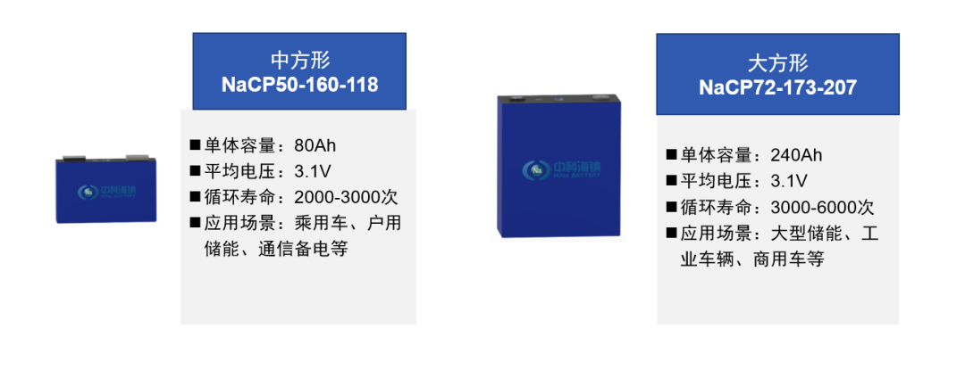而基于儲能、乘用車等,中科海鈉還發(fā)布了兩款方形電池:中方形 NaCP50-160-118、大方形 NaCP72-173-207。這兩款電池循環(huán)壽命基本上3000到6000次的水平,跟場景和使用工況相關(guān)。