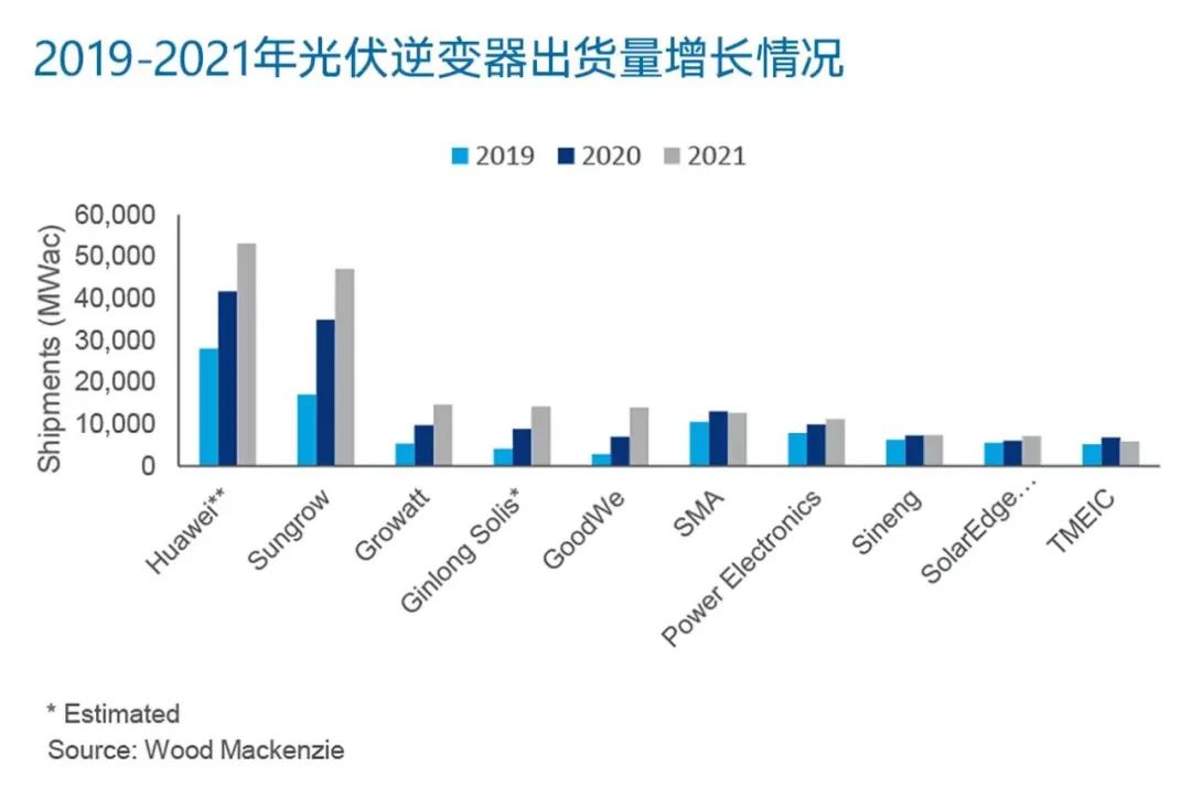 來自WoodMac的統(tǒng)計顯示,在全球前十的逆變器廠商中,國內(nèi)品牌占據(jù)六席,分別為華為、陽光電源、古瑞瓦特、錦浪、固德威、上能電氣。前十大逆變器廠商市場份額達82%。