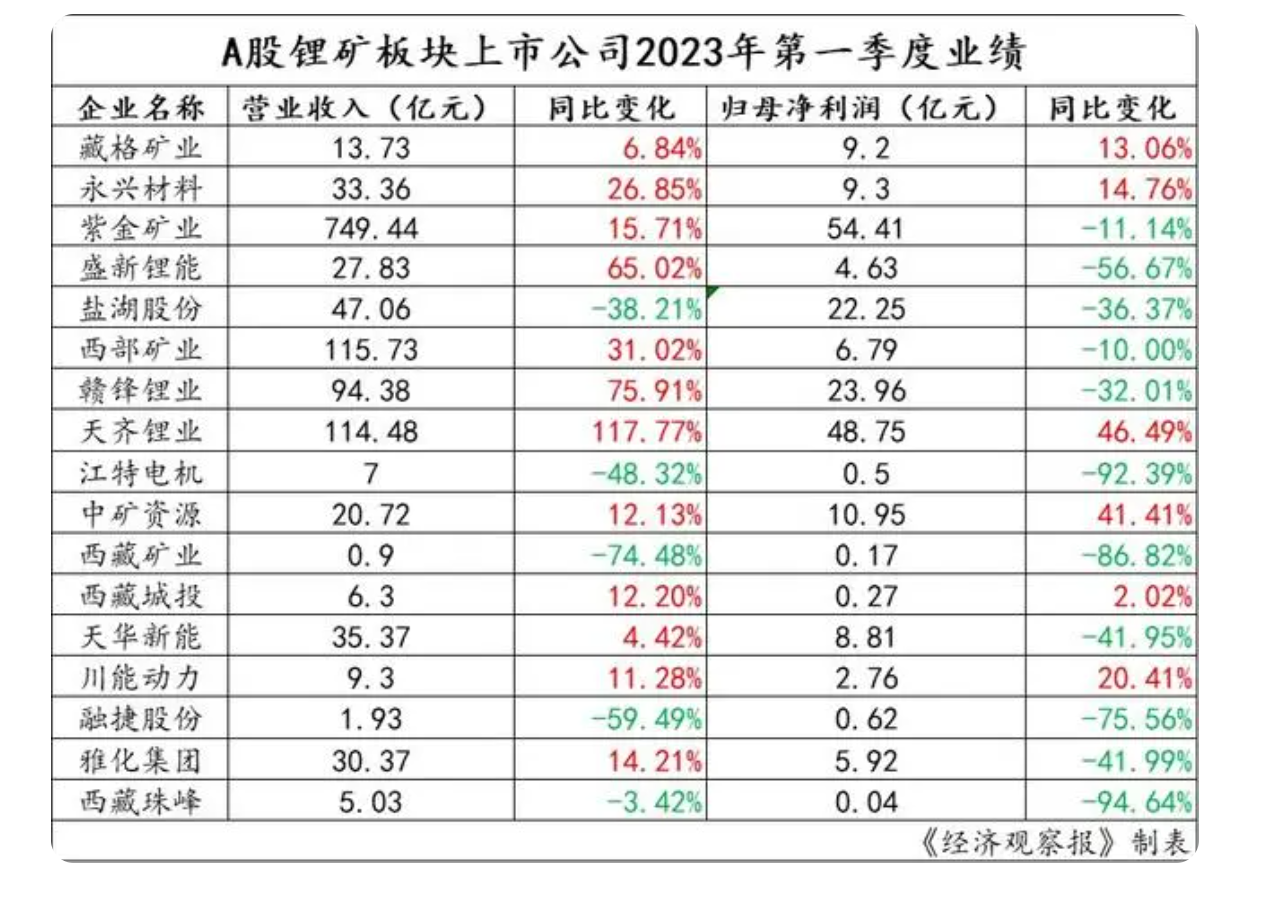 A股鋰礦板塊上市公司2023一季度業(yè)績
