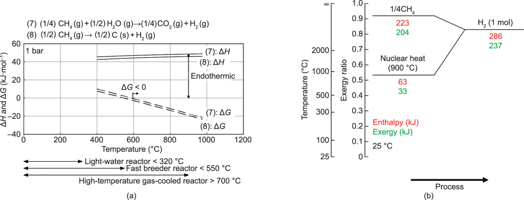 圖5(b)顯示了利用核熱能將甲烷轉(zhuǎn)化為氫氣的能量轉(zhuǎn)換圖。甲烷的?效比約為0.9。通過在甲烷中加入?效比約為0.5的核熱能,可以得到焓值為286 kJ、?為237 kJ的氫氣。