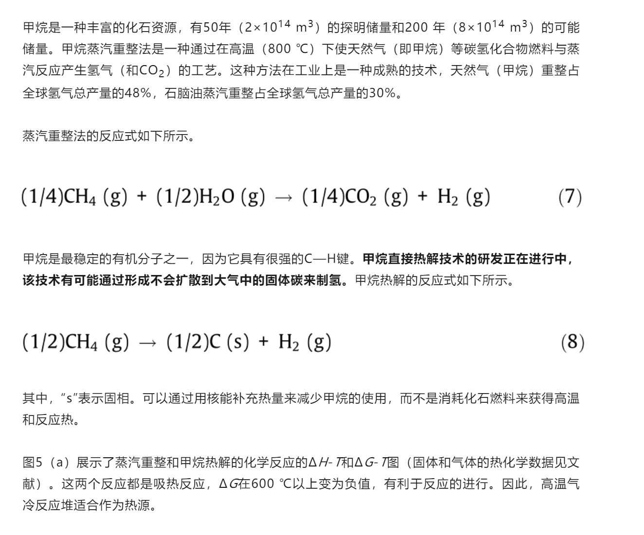 圖2中,下方所示的兩種制氫方法涉及使用碳?xì)浠衔镒鳛樵系奈鼰峄瘜W(xué)反應(yīng)。用核電補充化學(xué)反應(yīng)所需的熱量,可以減少制氫中的化石資源消耗。用碳?xì)浠衔锖退茪涞恼羝卣ㄊ且豁棾墒斓墓I(yè)技術(shù),而正在開發(fā)中的甲烷熱解法則將甲烷轉(zhuǎn)化為氫氣和固體碳。