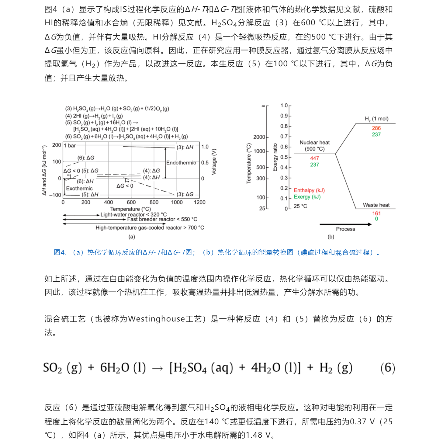 圖4(b)是用熱化學(xué)循環(huán)將核熱能轉(zhuǎn)化為氫能的能量轉(zhuǎn)換圖。原則上,1 mol的氫氣可以從447 kJ的熱量(900 ℃)中獲得。通過耗盡近一半約0.5(900 ℃)?效比的核熱能,可以將核熱能轉(zhuǎn)化為具有約0.8高?效比的氫能。