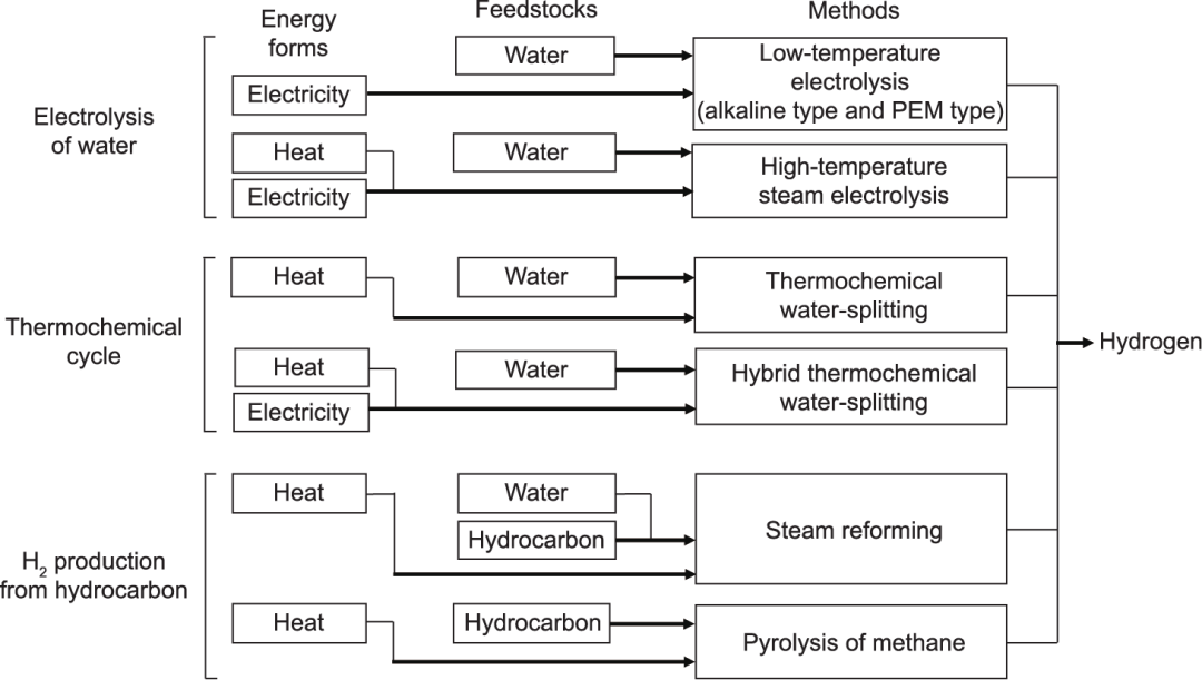 由于低溫水電解法可以僅由電能驅(qū)動,因此可以使用輕水反應(yīng)器、快中子增殖反應(yīng)器或高溫氣冷反應(yīng)器作為能源。高溫蒸汽電解所需的水汽化熱(i)也可以由輕水反應(yīng)堆、快中子增殖反應(yīng)堆或高溫氣冷反應(yīng)堆提供。