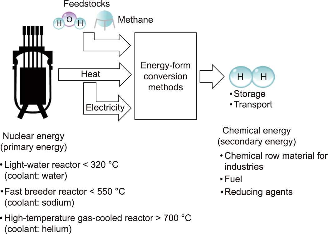 圖1展示了利用核能制氫所涉及的能量形式轉(zhuǎn)換。作為二次能源,氫氣可以通過將水或碳?xì)浠衔铮ɑY源)作為原料加入核能(一次能源)來生產(chǎn)。也就是說,這個過程將核能轉(zhuǎn)化為氫氣的化學(xué)能。產(chǎn)生熱能的核反應(yīng)堆包括以下反應(yīng)堆類型,每個反應(yīng)堆的熱能可用溫度從低到高排序:輕水反應(yīng)堆(冷卻劑:水);快中子增殖反應(yīng)堆(冷卻劑:鈉),以及高溫氣冷反應(yīng)堆(冷卻劑:氦氣)。