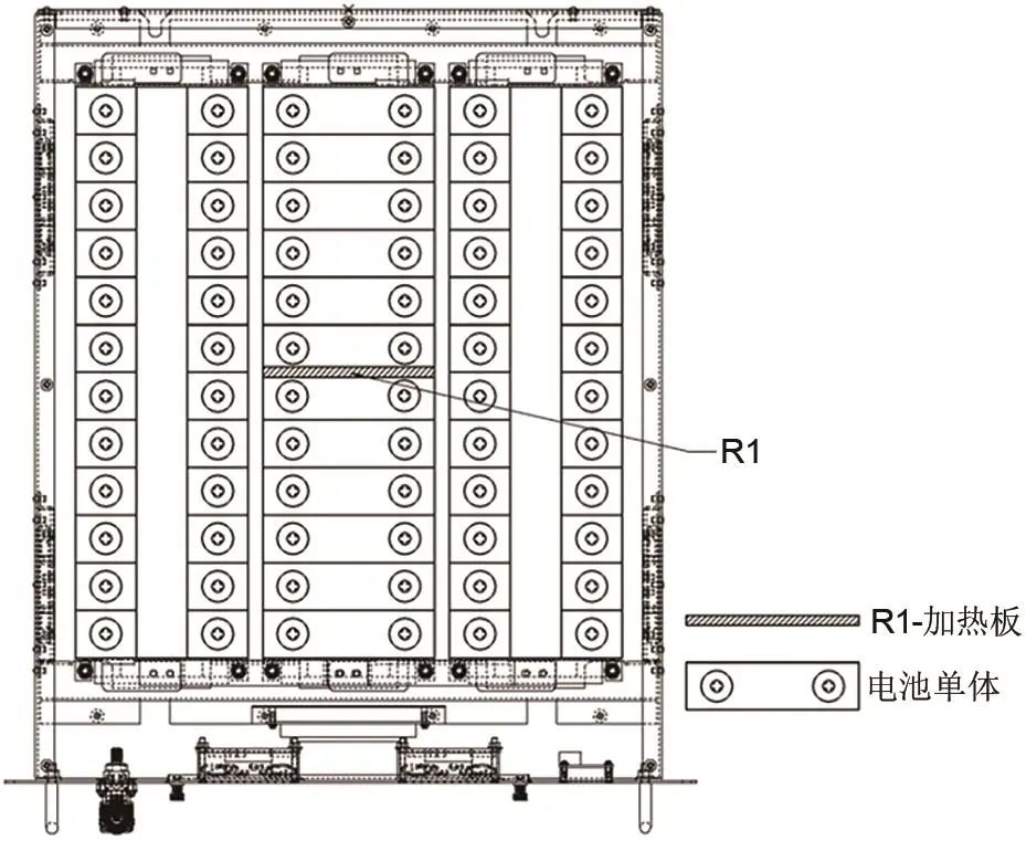 如圖7所示,采用加熱板安裝在電池模組中間,同時(shí)加熱兩個(gè)電池單體,加熱裝置宜選用平面狀,長(zhǎng)寬尺寸與電池單體接近,且與電池直接接觸,功率500~1200 W,電池箱內(nèi)設(shè)置電磁點(diǎn)火裝置,溫度數(shù)據(jù)采集頻率10 Hz。