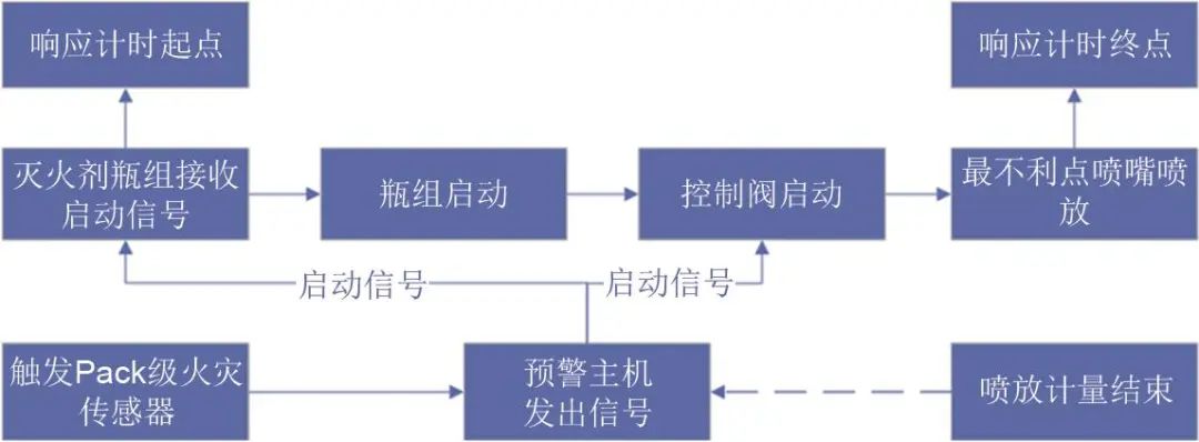 測(cè)試動(dòng)作流程如圖6所示,當(dāng)布置在Pack級(jí)內(nèi)的傳感器感應(yīng)到電池發(fā)生溫度異常時(shí),由預(yù)警主機(jī)接收感應(yīng)信號(hào)并進(jìn)行判定。預(yù)警主機(jī)根據(jù)所設(shè)定的程序向滅火劑瓶組和控制閥發(fā)出啟動(dòng)信號(hào),滅火劑瓶組啟動(dòng),通過(guò)主管道和分管道達(dá)到指定噴嘴位置釋放滅火劑直至明火撲滅。