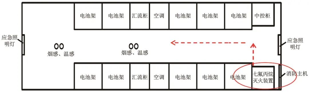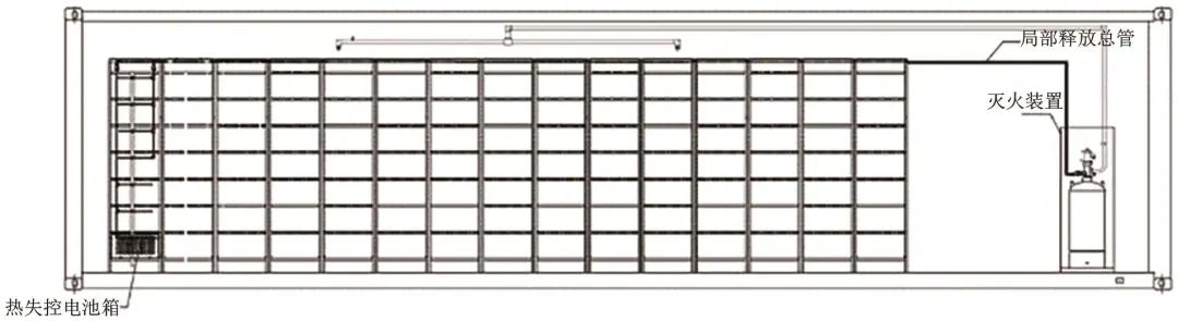 為了驗(yàn)證所開(kāi)發(fā)的靶向消防裝備對(duì)鋰離子電池火災(zāi)的效果,本工作搭建了1∶1全尺寸實(shí)驗(yàn)平臺(tái)。具體測(cè)試方法參考2.2節(jié)噴放功能測(cè)試,具體技術(shù)要求和測(cè)試方法可參考T/CIAPS0015—2022團(tuán)體標(biāo)準(zhǔn)《預(yù)制艙式鋰離子電池儲(chǔ)能系統(tǒng)火災(zāi)抑制裝置測(cè)試方法》。根據(jù)應(yīng)用場(chǎng)景,所設(shè)計(jì)的裝置火災(zāi)抑制試驗(yàn)空間容積為40尺標(biāo)準(zhǔn)集裝箱,選取1個(gè)100%荷電狀態(tài)(SOC)的電池模組,安裝在電池箱內(nèi),電池單體容量為80 Ah,電池Pack容量不小于8 kWh,電池單體及模組之間根據(jù)實(shí)際工況串并聯(lián),在集裝箱內(nèi)布置方式如圖5所示。