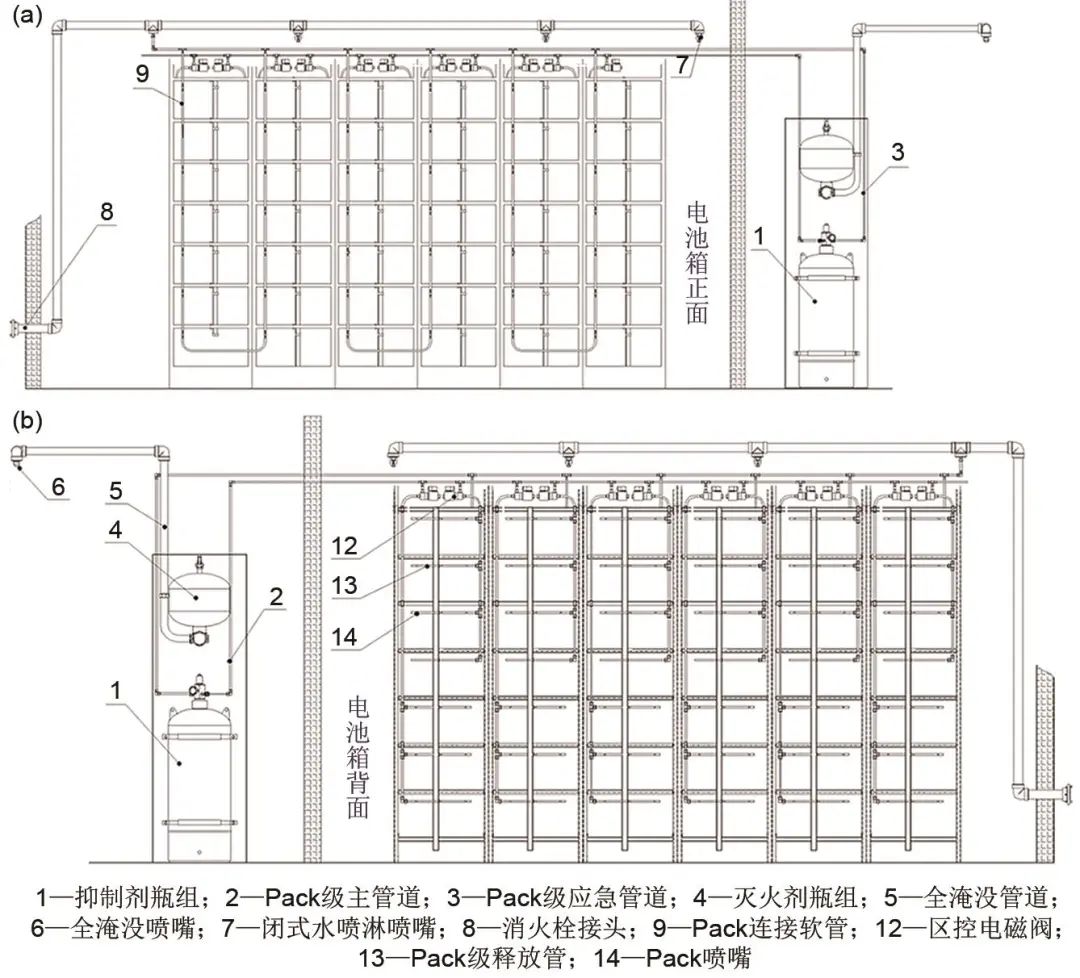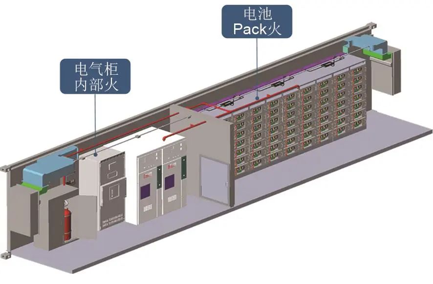 因此針對(duì)電化學(xué)儲(chǔ)能系統(tǒng),結(jié)合儲(chǔ)能系統(tǒng)結(jié)構(gòu)特點(diǎn)研發(fā)一種高效率且結(jié)構(gòu)和布局設(shè)計(jì)合理的滅火裝置迫在眉睫。本工作基于鋰離子電池儲(chǔ)能系統(tǒng)預(yù)制艙結(jié)構(gòu)特點(diǎn),構(gòu)建了多層協(xié)同預(yù)警技術(shù),實(shí)現(xiàn)對(duì)電氣火災(zāi)、電池火災(zāi)的精準(zhǔn)火災(zāi)預(yù)警。參考現(xiàn)有消防建設(shè)標(biāo)準(zhǔn)的基礎(chǔ)上,在現(xiàn)有七氟丙烷滅火系統(tǒng)基礎(chǔ)上增加鋰離子電池火災(zāi)抑制系統(tǒng),通過(guò)抑制系統(tǒng)中的Pack級(jí)釋放管道布置及時(shí)將全氟己酮滅火劑輸送至熱失控Pack,實(shí)現(xiàn)對(duì)熱失控電池的精準(zhǔn)防控,防止電池火災(zāi)蔓延。滅火系統(tǒng)和抑制系統(tǒng)協(xié)同作戰(zhàn),發(fā)揮各自?xún)?yōu)勢(shì),全面保障電化學(xué)儲(chǔ)能系統(tǒng)安全運(yùn)行。