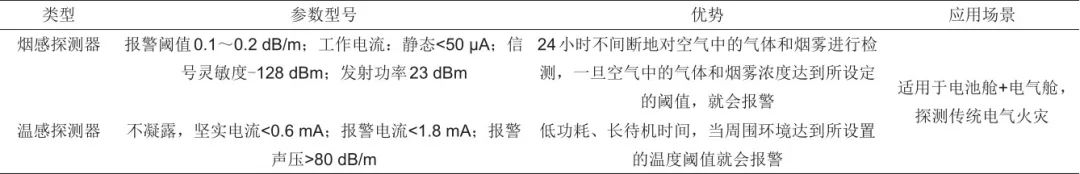 煙感探測(cè)器內(nèi)部采用離子式煙霧傳感,離子式煙霧傳感器性能遠(yuǎn)優(yōu)于氣敏電阻類(lèi)的火災(zāi)報(bào)警器。溫感探測(cè)器是利用探測(cè)器中的熱敏元件發(fā)生物理變化,響應(yīng)異常溫度、溫度速率等將溫度信號(hào)轉(zhuǎn)變?yōu)殡娦盘?hào),并進(jìn)行報(bào)警處理。如表1所示,煙/溫感探測(cè)器具有成本低、維護(hù)簡(jiǎn)單等優(yōu)勢(shì),適用于探測(cè)鋰離子電池儲(chǔ)能系統(tǒng)中的傳統(tǒng)電氣火災(zāi)。