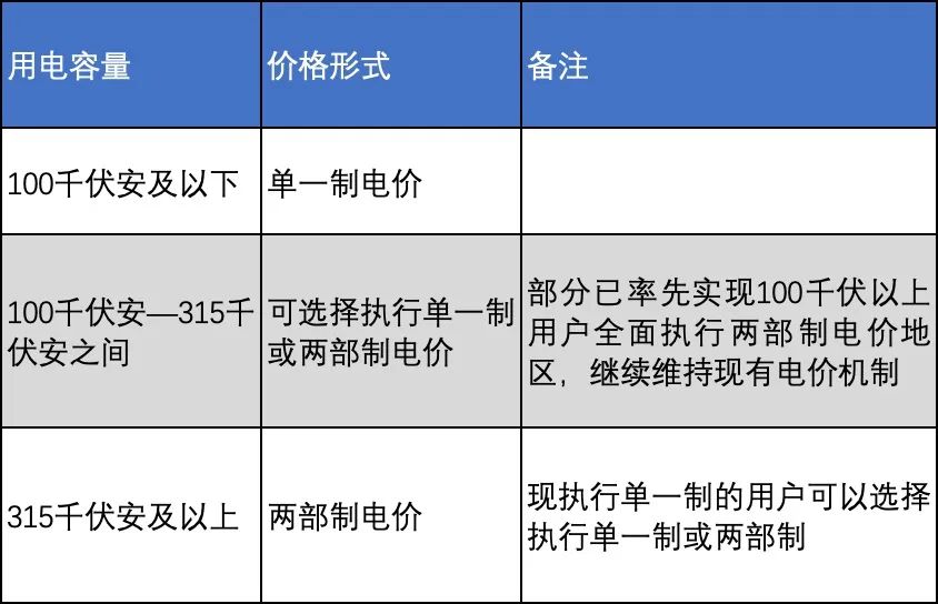 在價格形式上,現(xiàn)行普遍做法是一般工商業(yè)及其他用戶執(zhí)行單一制電價,大工業(yè)用戶實行兩部制電價。第三監(jiān)管周期不再區(qū)分用戶類別后,原則上按用電容量不同確定執(zhí)行單一制電價或兩部制電價,在繼續(xù)逐步擴大兩部制電價執(zhí)行范圍的同時,考慮電價政策平穩(wěn)實施,規(guī)定對100千伏安以上現(xiàn)行執(zhí)行單一制電價的用戶,由用戶選擇執(zhí)行單一制或兩部制電價。
