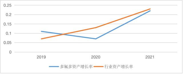 圖4 2019年~2021年多氟多和所在行業(yè)的資產(chǎn)增長(zhǎng)率的變動(dòng)情況