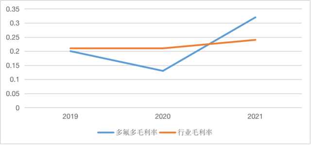 圖3 2019年~2021年多氟多和所在行業(yè)毛利率的變動(dòng)情況