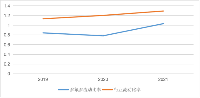 圖2 2019年~2021年多氟多和所在行業(yè)的流動(dòng)比率變動(dòng)情況