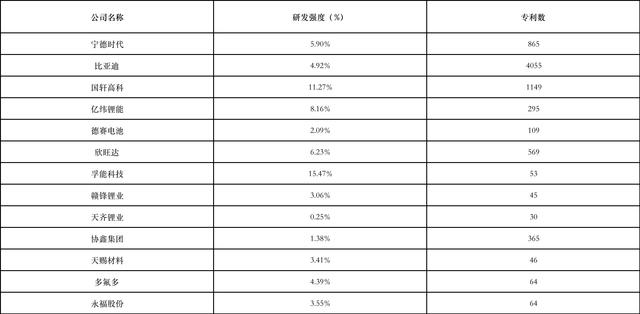表1 “電池供應(yīng)鏈”賽道企業(yè)研發(fā)強(qiáng)度和專利數(shù)