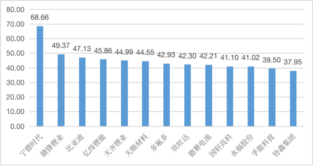 圖1 “電池產(chǎn)業(yè)鏈”賽道企業(yè)品牌優(yōu)勢(shì)值(100分制)
