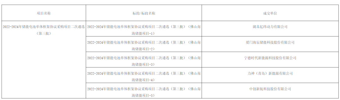 據(jù)悉,此次招標(biāo)標(biāo)段是2022-2024年儲能電池單體框架協(xié)議第三批二次遴選,將用于佛山南海儲能項(xiàng)目。共有5家公司為成交供應(yīng)商,分別是湖北億緯動(dòng)力有限公司,廈門海辰儲能科技股份有限公司,寧德時(shí)代新能源科技股份有限公司,力神(青島)新能源有限公司,中創(chuàng)新航科技股份有限公司。