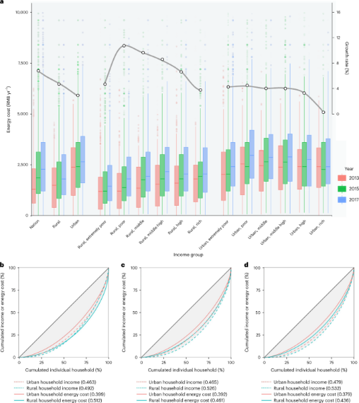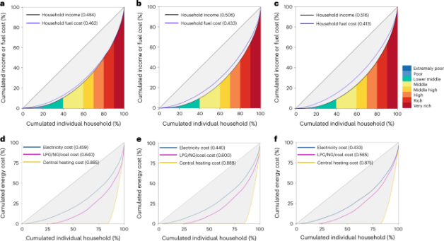 此外,從2013年到2017年,城市家庭能源成本的基尼指數(shù)從0.399降至0.379,農(nóng)村家庭能源成本的基尼指數(shù)從0.512降至0.436(圖3b-d)。然而,城市和農(nóng)村家庭收入的洛倫茲曲線都向“完全不平等”線傾斜,引起了人們對這個(gè)能源快速轉(zhuǎn)型時(shí)期能源負(fù)擔(dān)不平等的深切關(guān)注。