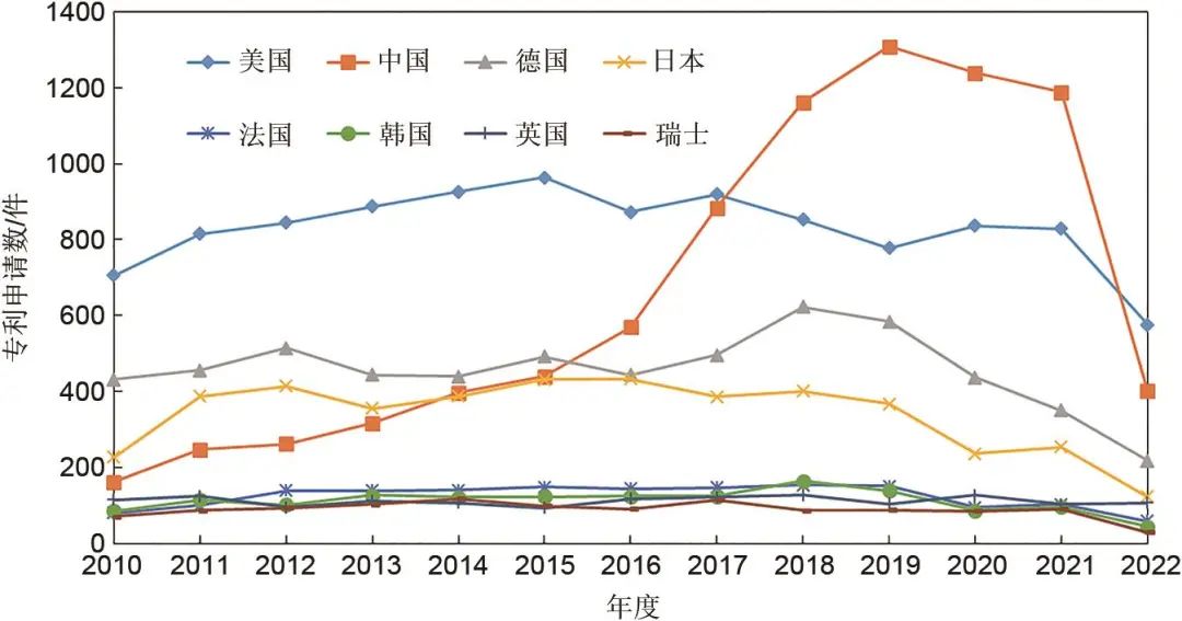 圖6給出了依據(jù)全球?qū)@麛?shù)據(jù)庫(kù)incoPat,以“Energy Storage”為主題詞在世界知識(shí)產(chǎn)權(quán)數(shù)據(jù)庫(kù)(WIPO)中統(tǒng)計(jì)的,2010—2022年世界主要國(guó)家關(guān)于儲(chǔ)能技術(shù)申請(qǐng)的國(guó)際發(fā)明專利數(shù)。需要說(shuō)明的是,2022年各國(guó)儲(chǔ)能技術(shù)發(fā)明專利申請(qǐng)數(shù)明顯偏低,這是由于數(shù)據(jù)庫(kù)統(tǒng)計(jì)滯后的原因,因此圖中2010—2021年的數(shù)據(jù)更具參考價(jià)值。圖中可見(jiàn),美國(guó)、中國(guó)、德國(guó)、日本、法國(guó)、韓國(guó)、英國(guó)、瑞士位列2010—2022年累計(jì)發(fā)明專利申請(qǐng)數(shù)前8名。從總體趨勢(shì)上看,除中國(guó)外,其他7個(gè)國(guó)家的儲(chǔ)能國(guó)際發(fā)明專利申請(qǐng)數(shù)均基本穩(wěn)定,而中國(guó)儲(chǔ)能國(guó)際發(fā)明專利申請(qǐng)數(shù)呈現(xiàn)持續(xù)增長(zhǎng)趨勢(shì),從2010年的全球第4位,提升到2018年的第一位,并且在此后一直保持居于世界第一位。盡管從2010—2022年WIPO國(guó)際發(fā)明專利累計(jì)總申請(qǐng)數(shù)中國(guó)仍少于美國(guó),但自2018年中國(guó)超越美國(guó)后,中國(guó)儲(chǔ)能國(guó)際發(fā)明專利申請(qǐng)數(shù)均高于美國(guó)(不考慮2022年滯后數(shù)據(jù))。