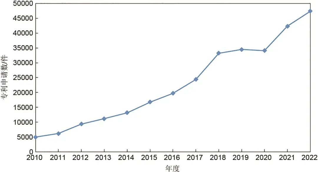 圖4給出了依據(jù)全球?qū)@麛?shù)據(jù)庫(kù)incoPat,以“Energy Storage”為主題詞統(tǒng)計(jì)的,2010年到2022年中國(guó)機(jī)構(gòu)在中國(guó)地區(qū)申請(qǐng)的發(fā)明專利數(shù)。從圖中可見(jiàn),從2010年到2022年中國(guó)儲(chǔ)能技術(shù)發(fā)明專利申請(qǐng)數(shù)持續(xù)增長(zhǎng),2022年中國(guó)儲(chǔ)能技術(shù)發(fā)明專利申請(qǐng)數(shù)為47406件,相較于2010年增長(zhǎng)近十倍。