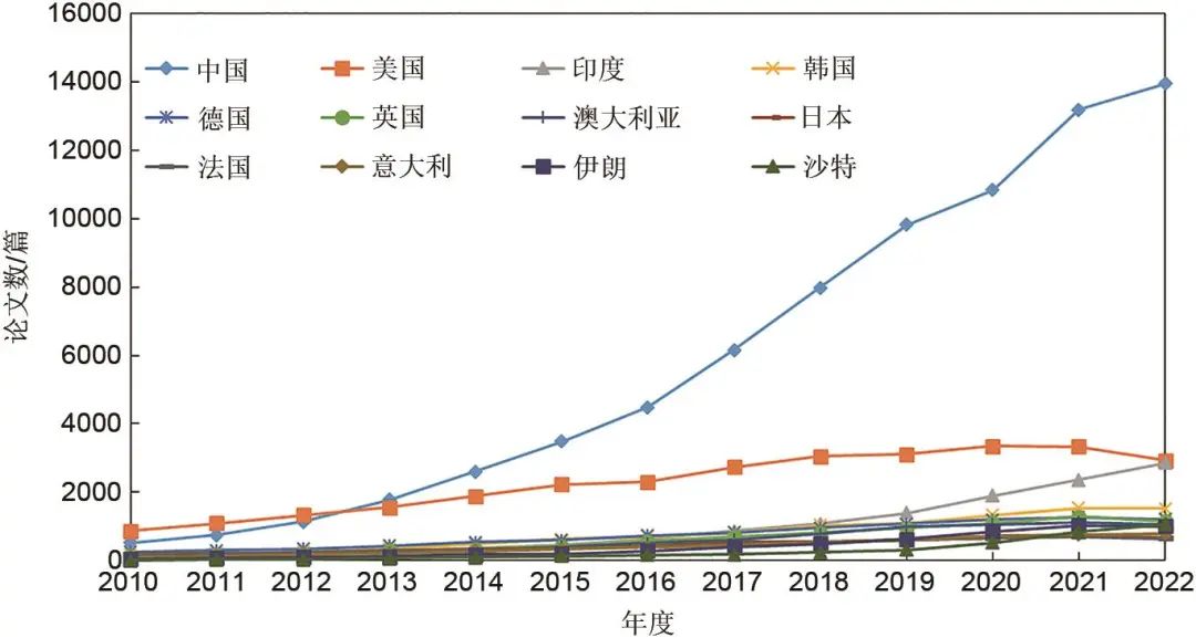 從發(fā)展趨勢(shì)看,自2010年以來(lái),所有12個(gè)國(guó)家發(fā)表的儲(chǔ)能相關(guān)SCI論文數(shù)均有所增加。這12個(gè)國(guó)家可以分為兩類:一類是美國(guó)、德國(guó)、英國(guó)、澳大利亞、日本、法國(guó)和意大利7個(gè)西方發(fā)達(dá)國(guó)家,它們的儲(chǔ)能相關(guān)SCI論文數(shù)大致經(jīng)歷了兩個(gè)時(shí)期,即2010—2016 年論文數(shù)快速增長(zhǎng),2017年開始論文數(shù)基本穩(wěn)定;另一類為中國(guó)、印度、韓國(guó)、伊朗和沙特這5個(gè)新興國(guó)家,它們的儲(chǔ)能相關(guān)SCI論文數(shù)自2010年以來(lái)一直在增長(zhǎng),目前仍保持上升趨勢(shì)。特別是中國(guó)和印度儲(chǔ)能相關(guān)SCI論文數(shù)增長(zhǎng)趨勢(shì)強(qiáng)勁,比如2010年中國(guó)的SCI論文數(shù)只有美國(guó)的約1/2,但到2013以后中國(guó)已超過(guò)美國(guó)成為全球儲(chǔ)能相關(guān)SCI論文數(shù)的第一大國(guó),2017年以后其SCI論文數(shù)已大幅領(lǐng)先美國(guó);印度2010年只有美國(guó)SCI論文數(shù)的約1/6,2022年已非常接近美國(guó)。