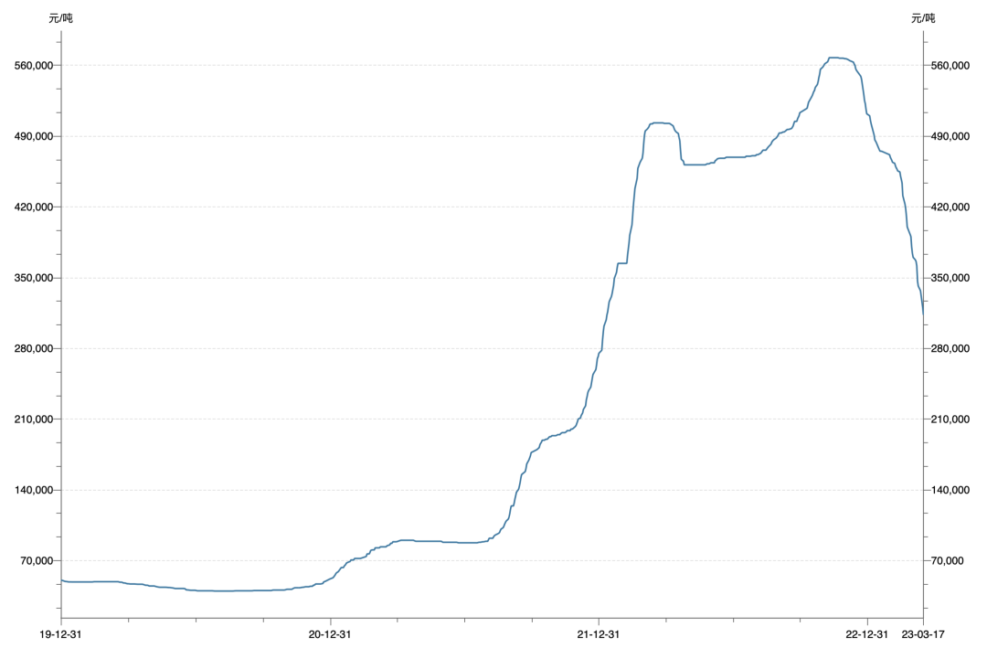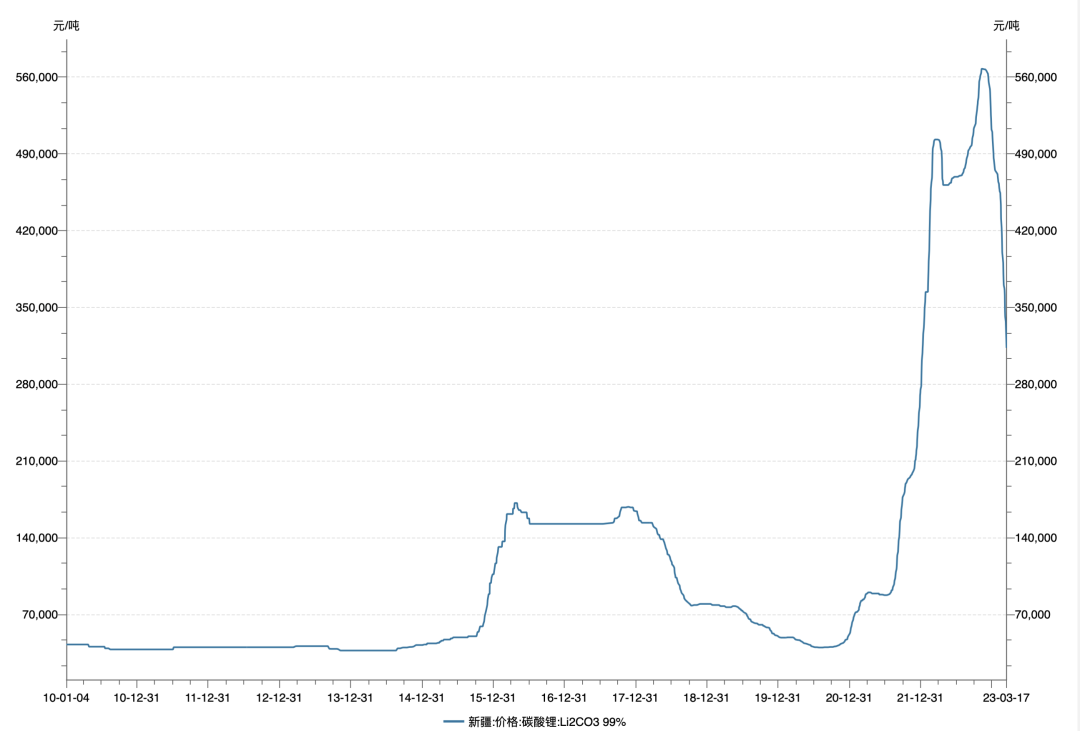 但是這些政策不如需求下降來得管用,2023年2月,隨著動(dòng)力電池的需求下降,碳酸鋰的價(jià)格自然一路下跌,囤積的碳酸鋰開始大量拋貨。