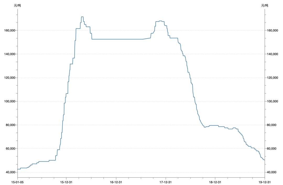 這波漲幅在2019年底停止了,新能源汽車補(bǔ)貼開始取消——國家補(bǔ)貼減半,地方補(bǔ)貼完全取消,動(dòng)力電池需求同時(shí)減弱,價(jià)格開始快速下墜,一年的時(shí)間基本回到最初的位置。