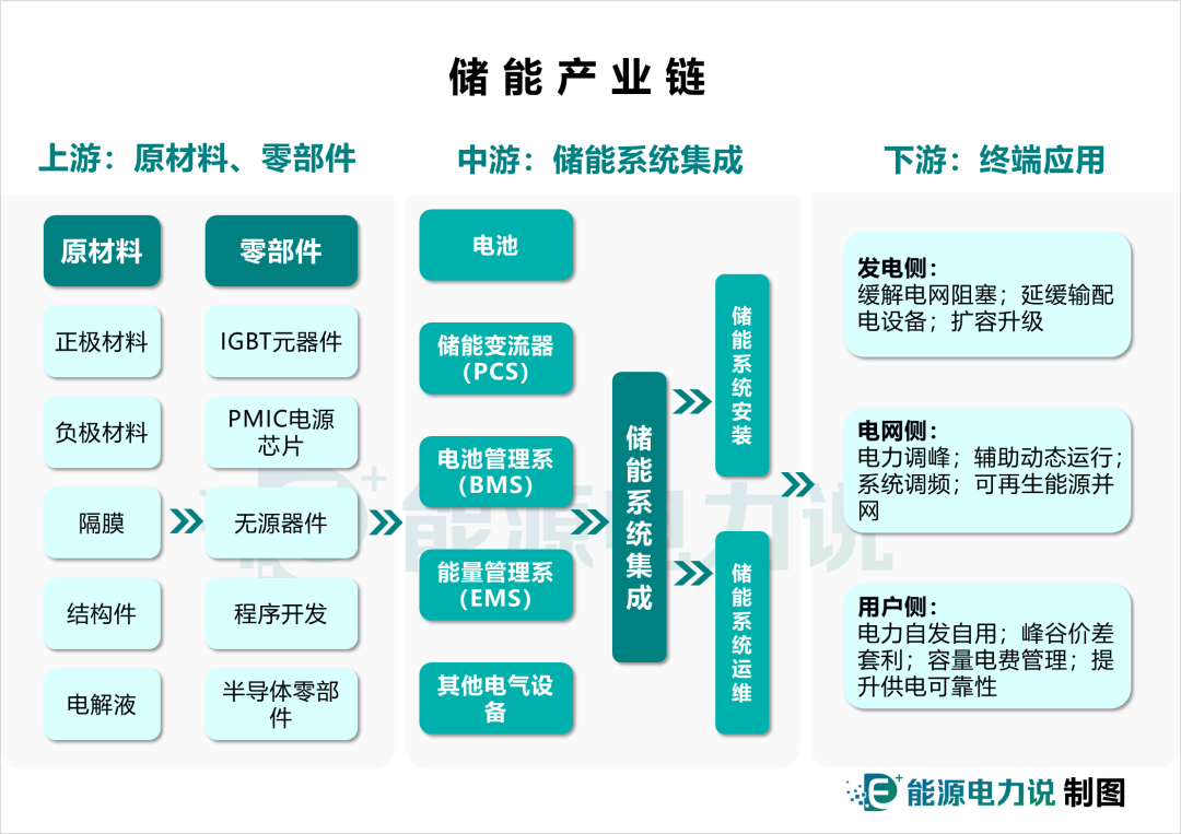 中國(guó)儲(chǔ)能網(wǎng)訊:從電化學(xué)儲(chǔ)能系統(tǒng)產(chǎn)業(yè)鏈來(lái)看,上游是電池原材料、電子元器件供應(yīng)商等;中游是儲(chǔ)能系統(tǒng)集成;下游應(yīng)用端則是風(fēng)光電站、電網(wǎng)系統(tǒng)、戶用/工商業(yè)、通信運(yùn)營(yíng)商、數(shù)據(jù)中心等終端用戶。一個(gè)典型的電化學(xué)儲(chǔ)能系統(tǒng)主要由電池、儲(chǔ)能變流器(PCS)、電池管理系統(tǒng)(BMS)、能量管理系統(tǒng)(EMS)四個(gè)核心部分構(gòu)成。