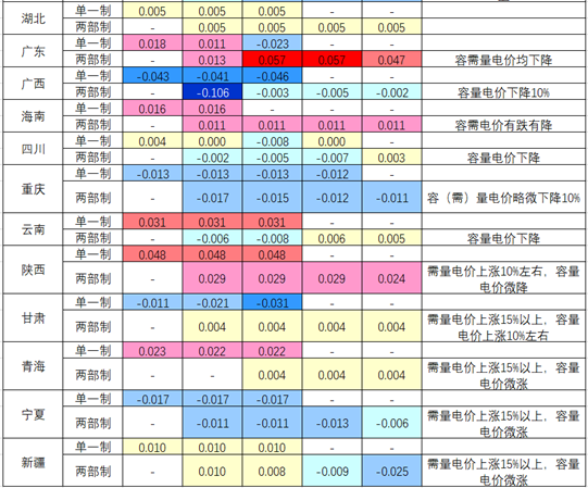 由于新版輸配電價(jià)不再包含上網(wǎng)環(huán)節(jié)線損費(fèi)用和抽水蓄能容量電費(fèi)等影響,要與上一版輸配電價(jià)進(jìn)行對(duì)比,需要將電度輸配電價(jià)、容(需)量電價(jià)、上網(wǎng)環(huán)節(jié)線損費(fèi)用折價(jià)、系統(tǒng)運(yùn)行費(fèi)用折價(jià)作為整體進(jìn)行對(duì)比,在此不妨稱為“綜合輸配成本”。同時(shí)由于上網(wǎng)環(huán)節(jié)線損、系統(tǒng)運(yùn)行費(fèi)用隨每個(gè)月購電價(jià)格、容量提供主體運(yùn)行變化等因素而略有變化,嚴(yán)格意義上下表只表明6月份的綜合輸配成本與第二周期輸配電價(jià)的對(duì)比,但對(duì)于新周期輸配電價(jià)的增減情況能提供大概的信息。筆者整理各省6月份綜合輸配成本與上一周期輸配電價(jià)對(duì)比如下表: