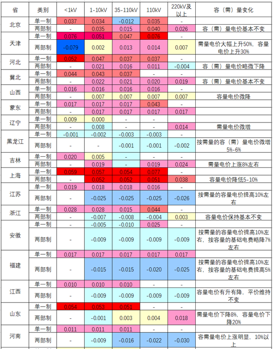 1.針對(duì)不同用戶的電價(jià)結(jié)構(gòu)更加合理。一是除個(gè)別省份對(duì)經(jīng)營性用戶仍劃分一般工商業(yè)、大工業(yè)外,其他省級(jí)單位均按照《通知》要求,僅按照用戶用電容量劃分單一制和兩部制,體現(xiàn)了公平性原則;二是按電壓等級(jí)不同執(zhí)行不同的容(需)量電價(jià),一般電壓越高,容(需)量電價(jià)越低,合理匹配了不同電壓等級(jí)容(需)量成本差異,有利于對(duì)增量配電網(wǎng)、大用戶等高電壓等級(jí)用戶的減負(fù)。