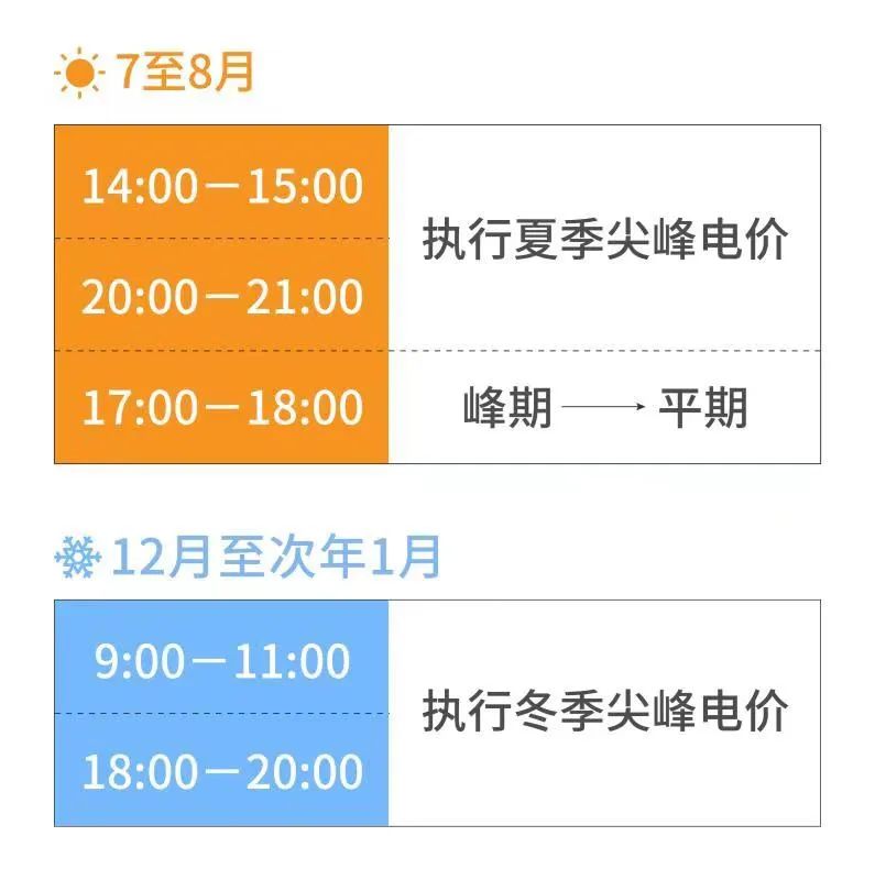 每年7至8月,14:00-15:00和20:00-21:00,執(zhí)行夏季尖峰電價(jià),同時(shí)將17:00-18:00從峰期調(diào)整為平期;12月至次年1月,9:00-11:00和18:00-20:00,執(zhí)行冬季尖峰電價(jià)。夏、冬兩季尖峰電價(jià),統(tǒng)一以峰段電價(jià)為基礎(chǔ),上浮20%。尖峰電價(jià)資金統(tǒng)籌用于全省能源電力保供工作。