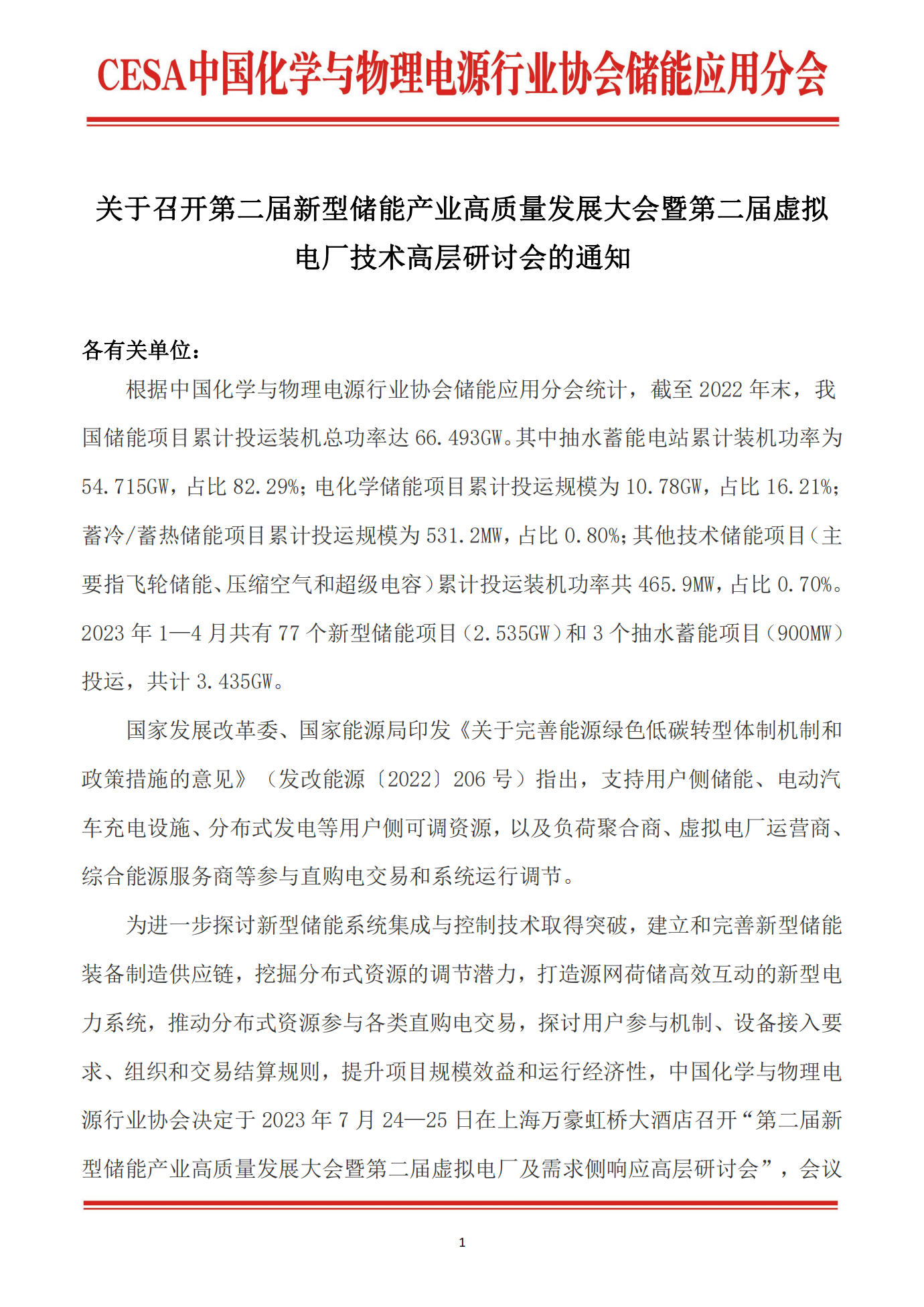 為進一步探討新型儲能系統(tǒng)集成與控制技術取得突破,建立和完善新型儲能裝備制造供應鏈,挖掘分布式資源的調節(jié)潛力,打造源網(wǎng)荷儲高效互動的新型電力系統(tǒng),推動分布式資源參與各類直購電交易,探討用戶參與機制、設備接入要求、組織和交易結算規(guī)則,提升項目規(guī)模效益和運行經(jīng)濟性,中國化學與物理電源行業(yè)協(xié)會決定于2023年7月24—25日在上海萬豪虹橋大酒店召開“第二屆新型儲能產業(yè)高質量發(fā)展大會暨第二屆虛擬電廠及需求側響應高層研討會”,會議同期將發(fā)布《2023中國虛擬電廠產業(yè)發(fā)展白皮書》,具體安排如下: