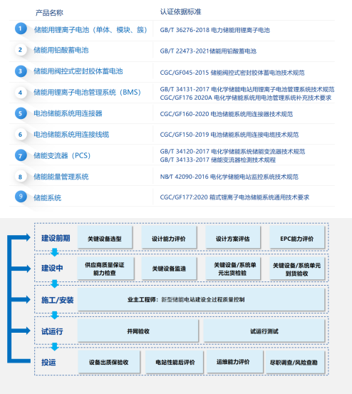 關鍵設備:關鍵部件需要通過形式認證,儲能系統(tǒng)圍繞關鍵設備選型質(zhì)量控制、儲能系統(tǒng)設計評估、儲能系統(tǒng)型式試驗、儲能系統(tǒng)集成過程質(zhì)量檢查、定型產(chǎn)品一致性管理整個鏈條進行質(zhì)量管控。特定工況應用方面:可通過生產(chǎn)過程監(jiān)造、FAT測試、業(yè)主工程師、電站現(xiàn)場試運行驗收測試進行質(zhì)量管控生命周期質(zhì)量閉環(huán)進行;鑒衡認證在“推動新型能源體系建設,促進儲能產(chǎn)業(yè)高質(zhì)量發(fā)展”中為關鍵設備制造商、系統(tǒng)集成商、EPC、電站業(yè)主、金融保險機構在新型儲能業(yè)務開展過程中的安全質(zhì)量風險管控及過程安全管理提供專業(yè)解決方案。