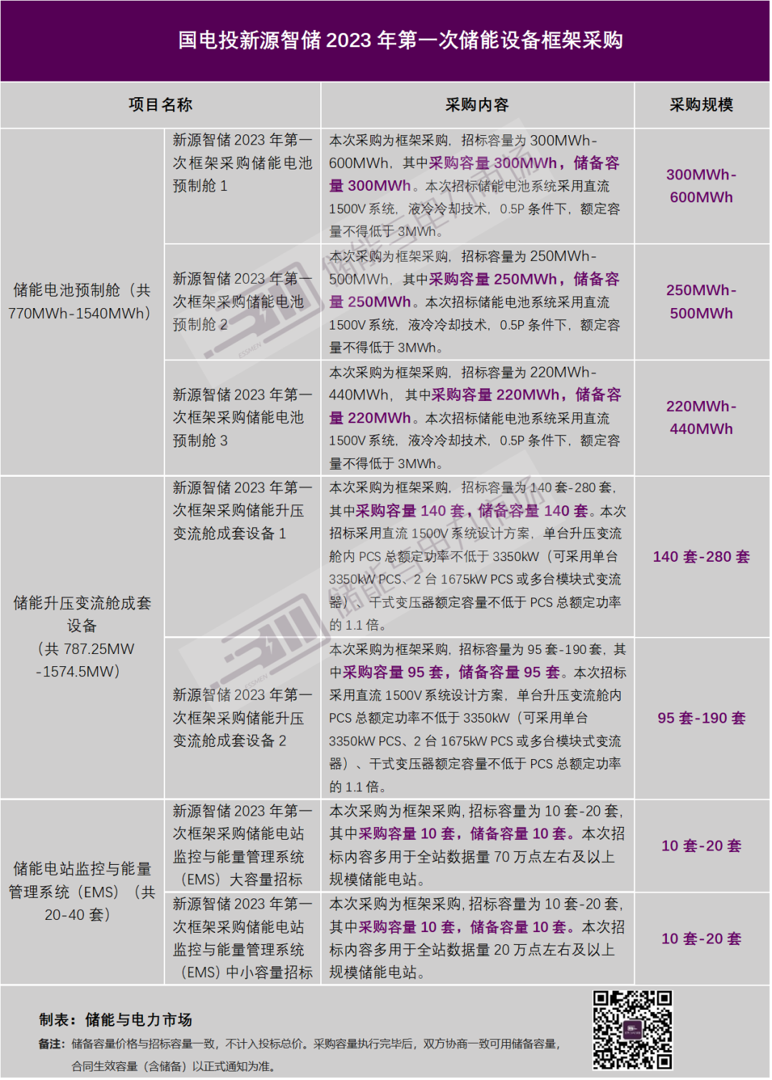 儲(chǔ)能與電力市場曾報(bào)道過該項(xiàng)目的招標(biāo),各個(gè)標(biāo)段的招標(biāo)要求、招標(biāo)規(guī)模如下表所示。