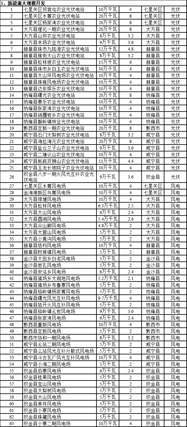 根據(jù)畢節(jié)市新型綜合能源基地建設(shè)重點(diǎn)項(xiàng)目表來(lái)看,涉及光伏、風(fēng)電、風(fēng)光制氫以及多能互補(bǔ)與源網(wǎng)荷儲(chǔ)一體化多個(gè)項(xiàng)目。其中光伏項(xiàng)目約26個(gè),規(guī)模為3.19GW,風(fēng)電項(xiàng)目為37個(gè),規(guī)模為2.374GW。多能互補(bǔ)以及源網(wǎng)荷儲(chǔ)項(xiàng)目為6個(gè),規(guī)模為11.62GW,光伏1.45GW,風(fēng)電為1.8GW。其中,國(guó)家電投集團(tuán)畢節(jié)千萬(wàn)千瓦級(jí)綜合能源基地新能源規(guī)劃規(guī)模為8.37GW。