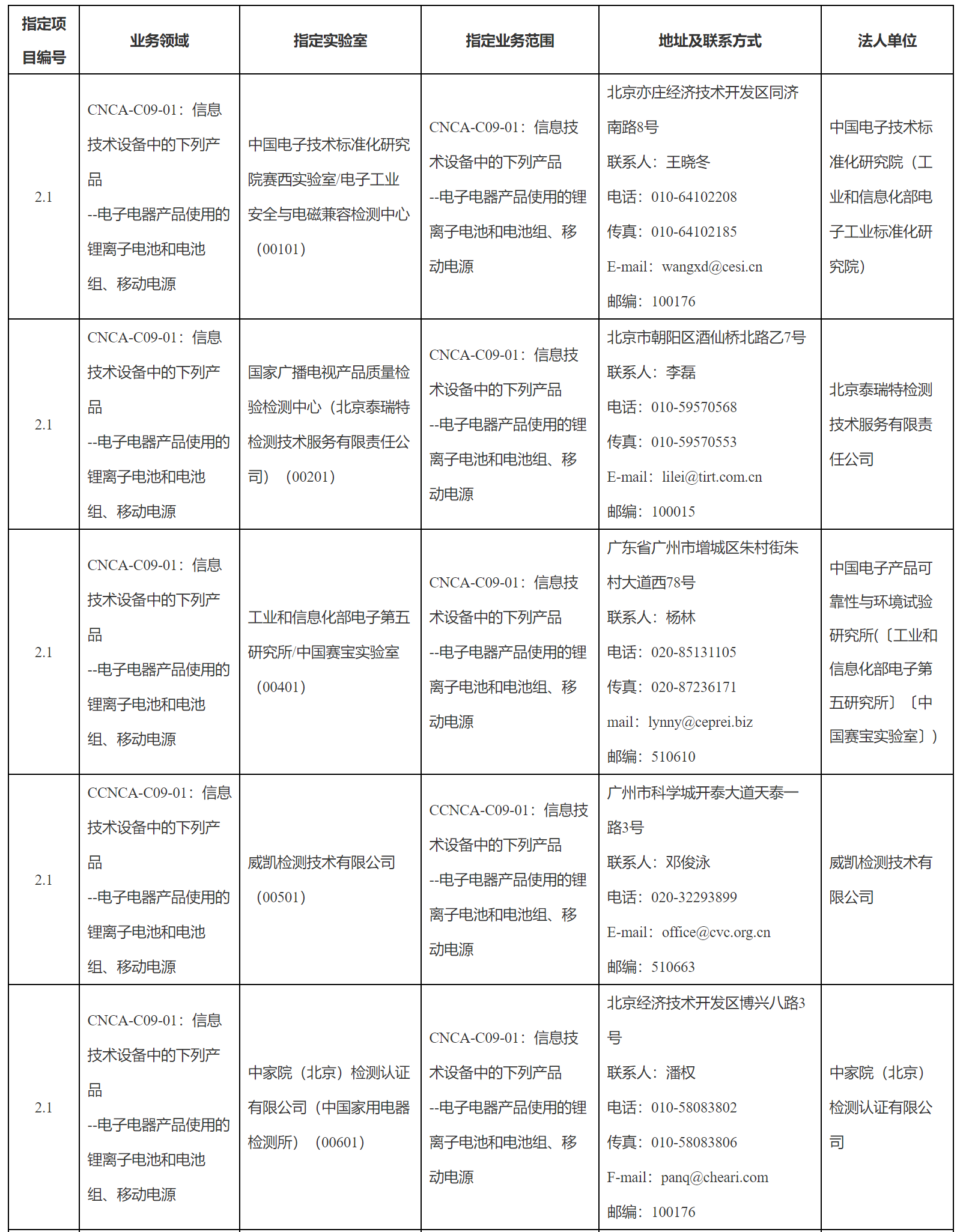 根據(jù)《認(rèn)證認(rèn)可條例》、《強(qiáng)制性產(chǎn)品認(rèn)證機(jī)構(gòu)和實(shí)驗(yàn)室管理辦法》和《認(rèn)監(jiān)委關(guān)于開展鋰離子電池等產(chǎn)品強(qiáng)制性產(chǎn)品認(rèn)證實(shí)施機(jī)構(gòu)指定工作的公告》(2023年第5號(hào)),現(xiàn)對(duì)電子電器產(chǎn)品使用的鋰離子電池和電池組、移動(dòng)電源強(qiáng)制性產(chǎn)品認(rèn)證實(shí)驗(yàn)室指定決定予以公告。