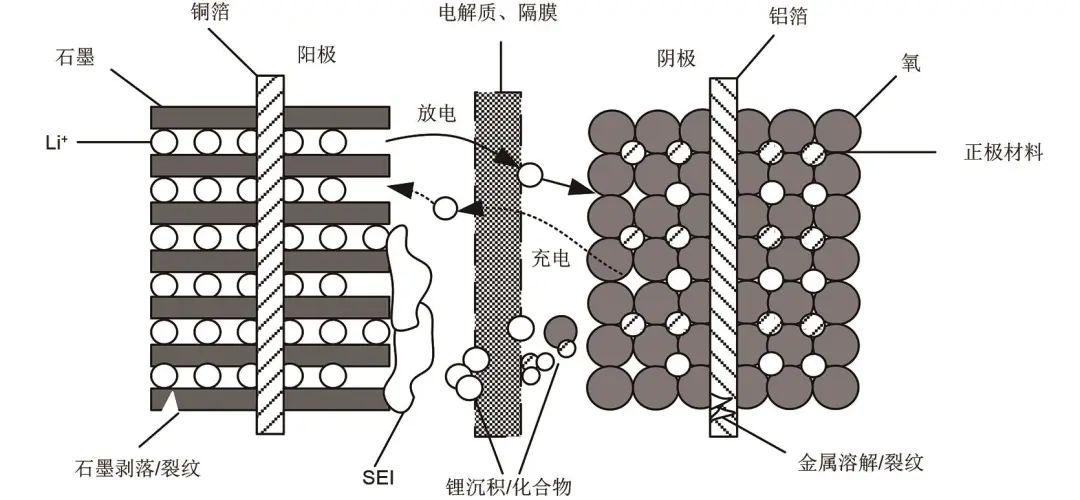 退役動力電池從回收到最后實際應用,對其當前狀態(tài)進行檢測評估必不可少,深入了解動力電池老化原理是各項評估技術發(fā)展進步的基礎。鋰電池是當前市場上使用最廣泛的電池之一,電池內部構成如圖3所示,在其充放電過程中會發(fā)生一些不可逆的化學反應導致電池的老化,老化機理可分為三類:鋰離子的損失(loss of lithium inventory,LLI)、活性材料的損失(loss of active material,LAM)以及內阻增加。鋰電池的工作原理是基于正極和負極活性材料的插層和脫層,因此鋰離子以及活性材料的數(shù)量直接影響電池的容量。LAM主要由石墨剝落、金屬溶解和顆粒斷裂等引起;LLI主要由鋰的沉積及固體電解質相界面膜(solid electrolyte interface,SEI)引起,首次充放電時鋰離子會跟電解質和有機溶劑發(fā)生反應,在電極與電解液的接觸面上生成SEI保護電池內部結構穩(wěn)定,但會不可逆地消耗鋰和電解質,導致電池性能衰退。