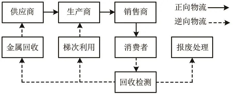 退役電池的回收具有逆向物流的特點,如圖2所示。目前根據(jù)回收主體的不同,存在三種主流回收模式:生產商回收模式、第三方回收模式以及聯(lián)盟(合作)回收模式。生產商回收模式指電池或汽車廠商直接對電池進行回收利用,其優(yōu)勢是對產品較為熟悉,回收方便,但回收產品單一,規(guī)模較小,經(jīng)濟性較低;第三方回收模式指第三方回收企業(yè)對電池進行回收與轉售,其優(yōu)勢是專業(yè)性較強且規(guī)模較大,但回收種類多樣化,技術要求較高;聯(lián)盟回收模式指生產商與第三方企業(yè)進行合作,其優(yōu)勢是渠道多、影響力廣、規(guī)模大,但對雙方企業(yè)存在一定約束,合作要求高。