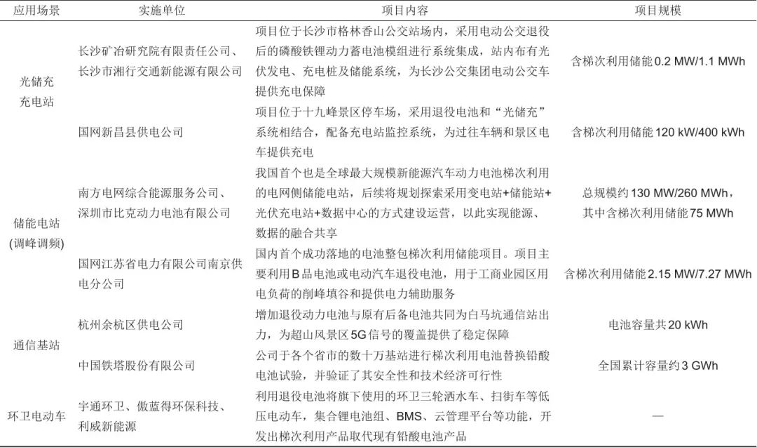 退役動力電池在經(jīng)檢測評估后,根據(jù)電池狀態(tài)的不同可應用于不同場景。理論上高容量的電池可于電池更換和儲能應用領域發(fā)揮作用,低容量的則可用作備用電池、照明、基站、家庭儲能及UPS不間斷電源,或是充電樁、低速電動車等低倍率放電應用場景[16]。國內現(xiàn)階段應用主要集中于儲能、基站電源、低速電車等領域,國家電網(wǎng)、中國鐵塔公司以及比亞迪、寶馬等汽車企業(yè)相繼積極規(guī)劃梯次利用示范工程,部分應用案例見表2。