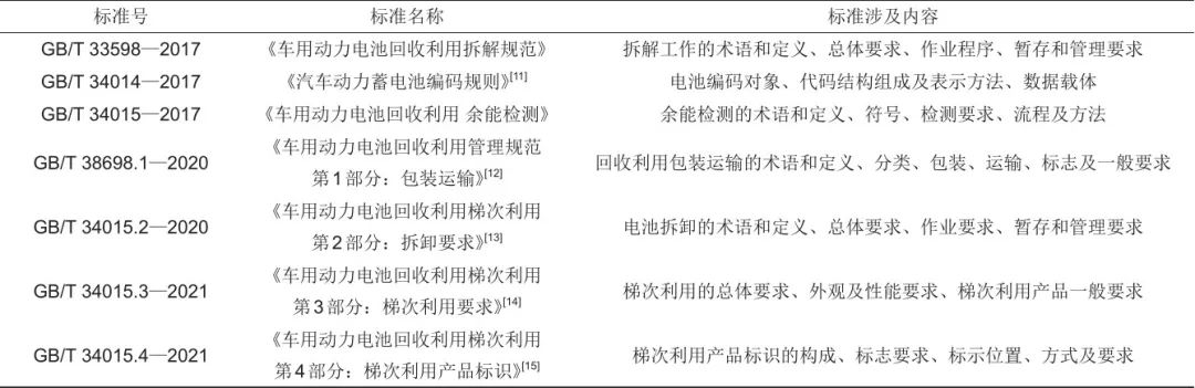 此前動力電池梯次利用沿用動力電池領域通用標準,如GB/T 33598—2017《車用動力電池回收利用拆解規(guī)范》、GB/T 34015—2017《車用動力電池回收利用 余能檢測》等。但動力電池生產廠商、歷史運行數(shù)據(jù)不盡相同,導致其退役后的狀態(tài)存在較大差異,缺乏一致性,因此部分動力電池的標準有一定的局限性,無法清晰地規(guī)范梯次利用各環(huán)節(jié)的經(jīng)濟性、統(tǒng)一性、安全性。2021年,工信部等五部門聯(lián)合印發(fā)《新能源汽車動力蓄電池梯次利用管理辦法》,作為梯次利用的第一件專項文件,在以往措施基礎之上作出建設,鼓勵企業(yè)合作,加強行業(yè)管理,同時印發(fā)國家標準《車用動力電池回收利用 梯次利用》,明確了梯次利用產品及回收利用各環(huán)節(jié)的規(guī)范,涉及相關標準見表1。