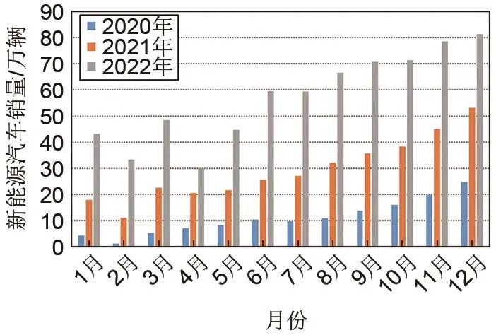 基于能源緊缺及清潔環(huán)保的壓力,新能源汽車在世界范圍內得到了極速發(fā)展。近年來隨著我國“碳中和、碳達峰”戰(zhàn)略的實施及相關政策的推出,國內新能源汽車產銷更是發(fā)生了爆發(fā)式增長。據(jù)中國汽車工業(yè)協(xié)會相關數(shù)據(jù)指出,我國新能源汽車銷量于2022年12月達到81.4萬輛(圖1),其中純電動汽車達到62.4萬輛,插電式混合動力汽車銷量達到18.9萬輛,與2021年相比增長0.5倍和1.3倍。2022年全年新能源汽車銷量總計達到688.7萬輛,同比增長0.9倍。