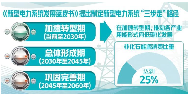 6月2日,國家能源局組織11家研究機構(gòu)編制的《新型電力系統(tǒng)發(fā)展藍皮書》發(fā)布。藍皮書提出制定新型電力系統(tǒng)“三步走”發(fā)展路徑,即加速轉(zhuǎn)型期(當(dāng)前至2030年)、總體形成期(2030年至2045年)、鞏固完善期(2045年至2060年),有計劃、分步驟推進新型電力系統(tǒng)建設(shè)。在加速轉(zhuǎn)型期,推動各產(chǎn)業(yè)用能形式向低碳化發(fā)展,非化石能源消費比重達到25%。新能源開發(fā)實現(xiàn)集中式與分布式并舉,引導(dǎo)產(chǎn)業(yè)由東部向中西部轉(zhuǎn)移。