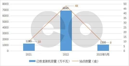 圖2:2021年1月—2023年5月全國已核準的抽水蓄能電站裝機容量和數量