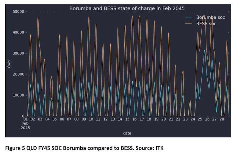 該圖表顯示,這兩個系統(tǒng)通常都處于零充電狀態(tài),但電池的額外電量意味著它比低功率 Borumba 資產(chǎn)更容易充電,這也是它能夠輕松超越 Borumba 的原因。
