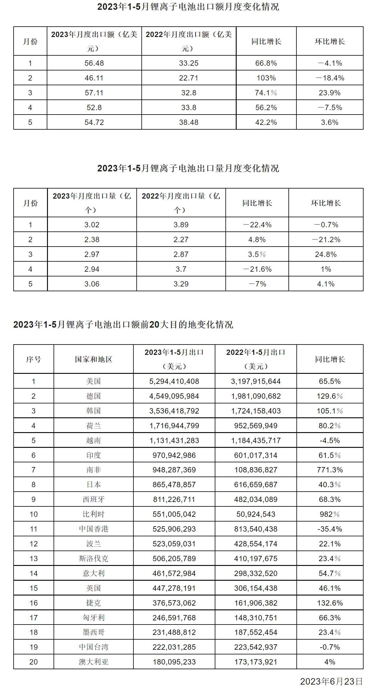 中國儲(chǔ)能網(wǎng)訊:2023年1-5月我國鋰離子電池累積出口額為267.15億美元,2022年同期為161.04億美元,同比增長(zhǎng)65.9%;2023年1-5月鋰離子電池累積出口數(shù)量為14.36億個(gè),2022年同期為16.02億個(gè),同比減少10.4%。其中,2023年5月鋰離子電池出口額為54.72億美元,同比增長(zhǎng)42.2%,環(huán)比增長(zhǎng)3.6%;2023年5月鋰離子電池出口數(shù)量為3.06億個(gè),同比減少7%,環(huán)比增長(zhǎng)4.1%。