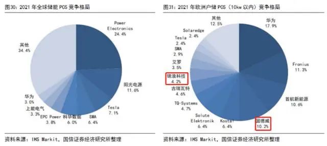 國信證券研報指出,歐洲戶儲PCS方面,華為17.9%份額位居第一,國內(nèi)企業(yè)首航新能源,固德威,古瑞瓦特,錦浪科技均在前十。隨著錦浪科技、固德威、德業(yè)股份等國內(nèi)企業(yè)在儲能變流器中的生產(chǎn)、渠道布局建設(shè)加速,預(yù)計國產(chǎn)儲能PCS企業(yè)在全球市場份額將提升。