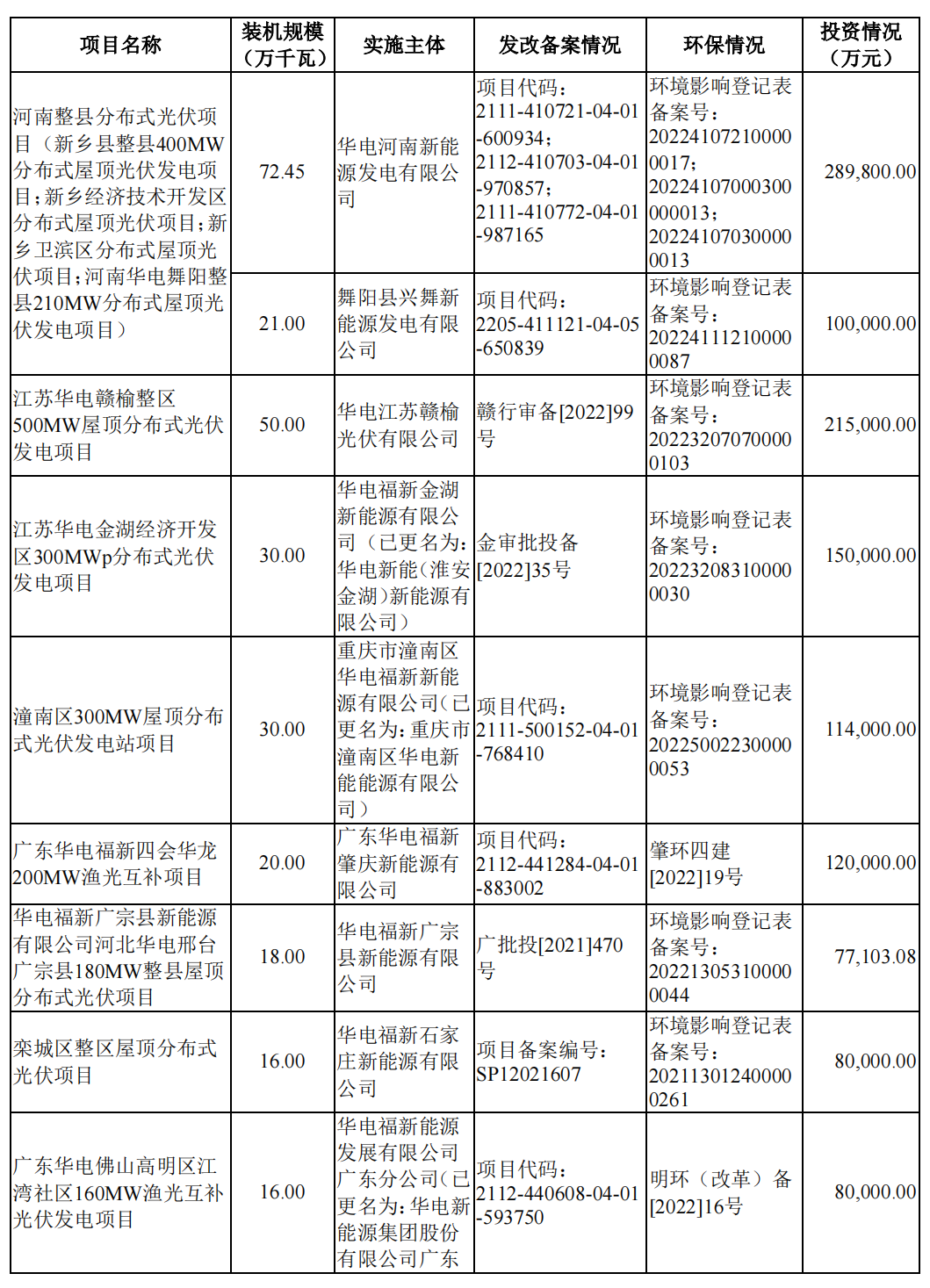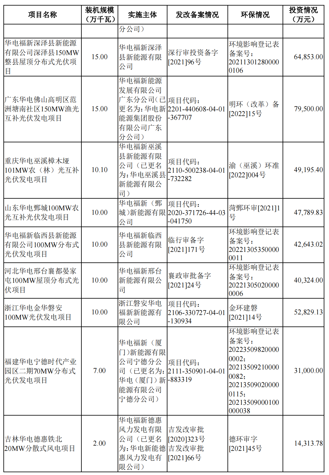 華電新能源在中東部負(fù)荷中心及周邊地區(qū)開發(fā)建設(shè)分散式風(fēng)電和分布式光伏,充分發(fā)揮負(fù)荷中心就地生產(chǎn)就地消納特色,積極探索光伏與其他產(chǎn)業(yè)的融合,布局光伏復(fù)合以及整縣光伏等“就地消納負(fù)荷中心項(xiàng)目”,項(xiàng)目平均資本金凈利潤(rùn)率為 11.24%,平均投資回收期(稅后)為 13.00 年,具體項(xiàng)目如下表。
