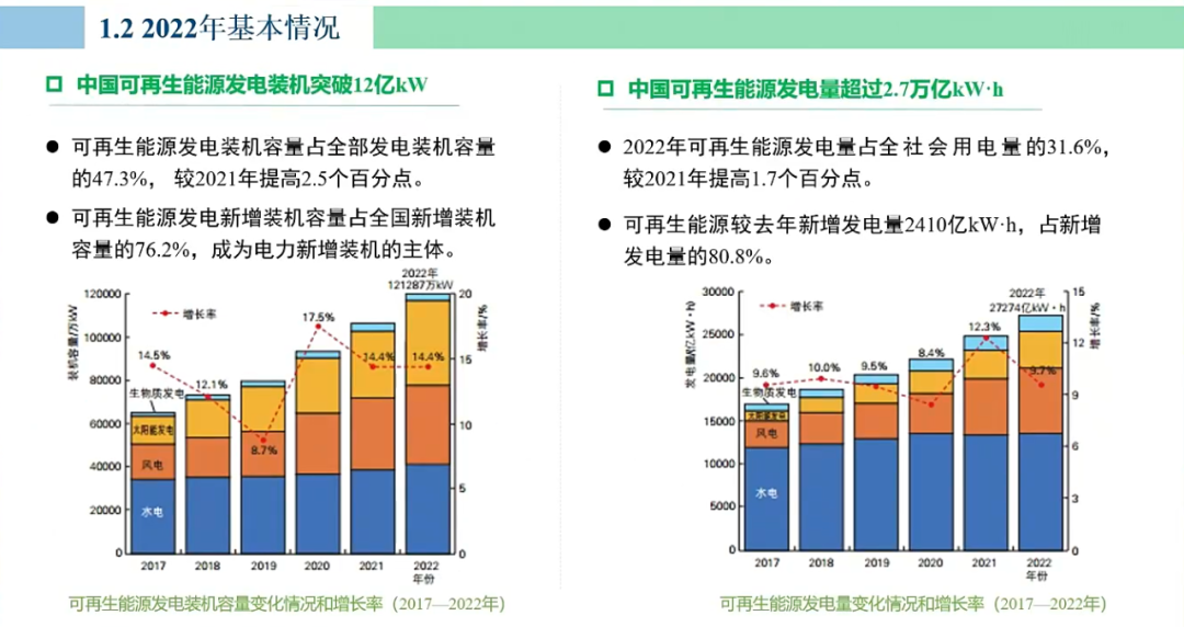 據(jù)易躍春介紹,2022年,我國(guó)可再生能源發(fā)電裝機(jī)突破12億kW,可再生能源發(fā)電裝機(jī)容量占全部發(fā)電裝機(jī)容量的47.3%,較2021年提高2.5個(gè)百分點(diǎn),可再生能源發(fā)電新增裝機(jī)容量占全國(guó)新增裝機(jī)容量的76.2%,成為電力新增裝機(jī)的主體。與此同時(shí),我國(guó)可再生能源發(fā)電量超過(guò)2.7萬(wàn)億kW·h,全年可再生能源發(fā)電量占全社會(huì)用電量的31.6%,較2021年提高1.7個(gè)百分點(diǎn),可再生能源較去年新增發(fā)電量2410億kW·h,占新增發(fā)電量的80.8%。