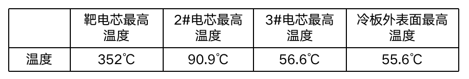 根據(jù)現(xiàn)場(chǎng)監(jiān)控?cái)?shù)據(jù)顯示,熱失控那顆電芯最高溫度達(dá)到了352度,而相鄰的2#電芯過(guò)程最高溫度為90.9℃,3#電芯過(guò)程最高溫度為56.6℃,冷板外表面最高溫度為55.6℃。