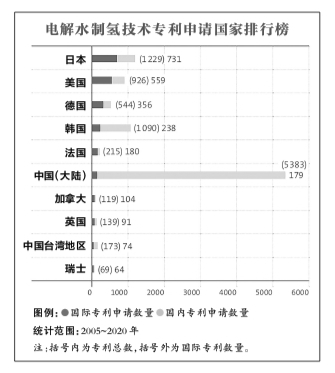 電解水制氫相關(guān)專(zhuān)利數(shù)量增長(zhǎng)主要來(lái)自中國(guó),中國(guó)申請(qǐng)人主要關(guān)注國(guó)內(nèi)市場(chǎng),中國(guó)申請(qǐng)的相關(guān)專(zhuān)利中僅3%為國(guó)際專(zhuān)利。從專(zhuān)利申請(qǐng)總數(shù)來(lái)看,排在中國(guó)之后的依次是日本、韓國(guó)、美國(guó)、德國(guó)和法國(guó)。歐盟此前推出了氫能發(fā)展戰(zhàn)略,將綠氫作為發(fā)展的重點(diǎn),歐洲國(guó)家專(zhuān)利申請(qǐng)數(shù)量也居于前列。