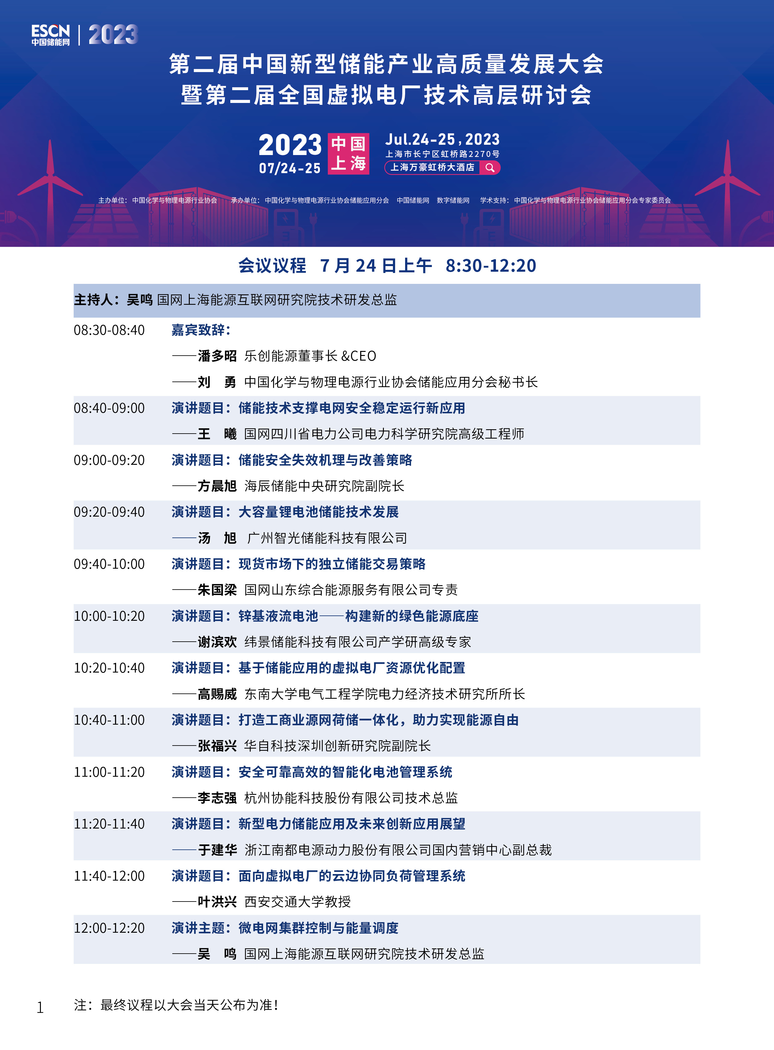 您好!第二屆中國(guó)新型儲(chǔ)能產(chǎn)業(yè)高質(zhì)量發(fā)展大會(huì)暨第二屆全國(guó)虛擬電廠技術(shù)高層研討會(huì)將于2023年7月24-25日在上海萬(wàn)豪虹橋大酒店如期舉行,非常感謝您百忙之中出席本次大會(huì),以下為會(huì)議具體安排。
